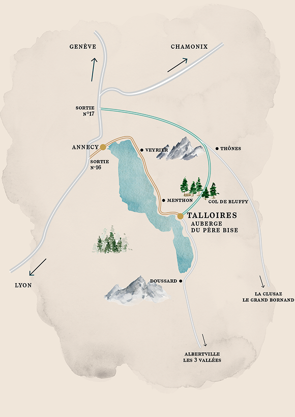 Rejoignez Talloires-Montmin en bus depuis la gare d’Annecy en prenant la ligne 20 Sibra jusqu’à l’arrêt “Écoles”, situé à 500 mètres à pied de l’Auberge.
