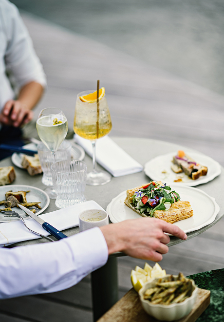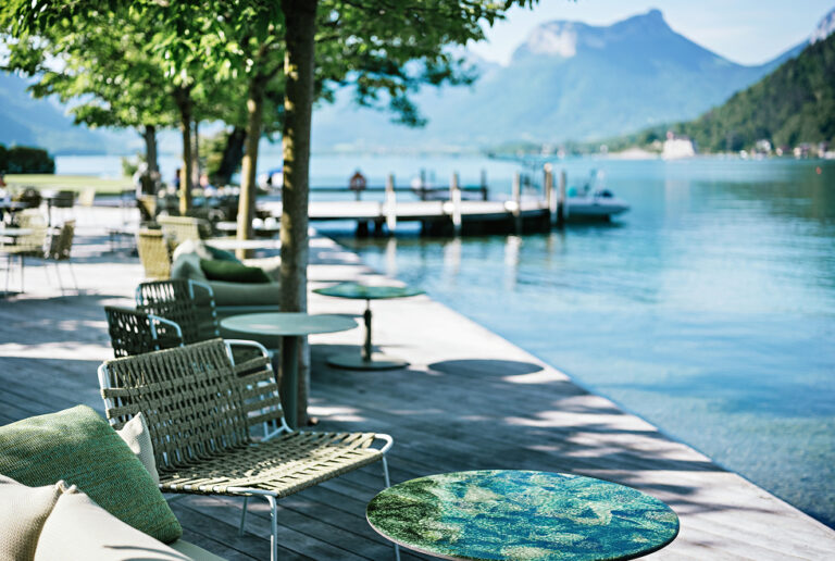For those feeling peckish, for the pleasure of tea time facing the Entrevernes mountain or an aperitif with your feet in the water of Lake Annecy, the Marius Bar offers a wonderful selection of pastries (warm chocolate soufflé, Marjolaine, the Bise family’s signature dish) and finger food (fried perch, a basket of fresh fruit and vegetables accompanied by tartines of lake féra, candied lemon, and pormonier in puff pastry). Depending on the season, themed snacks are also available, much to the delight of families.