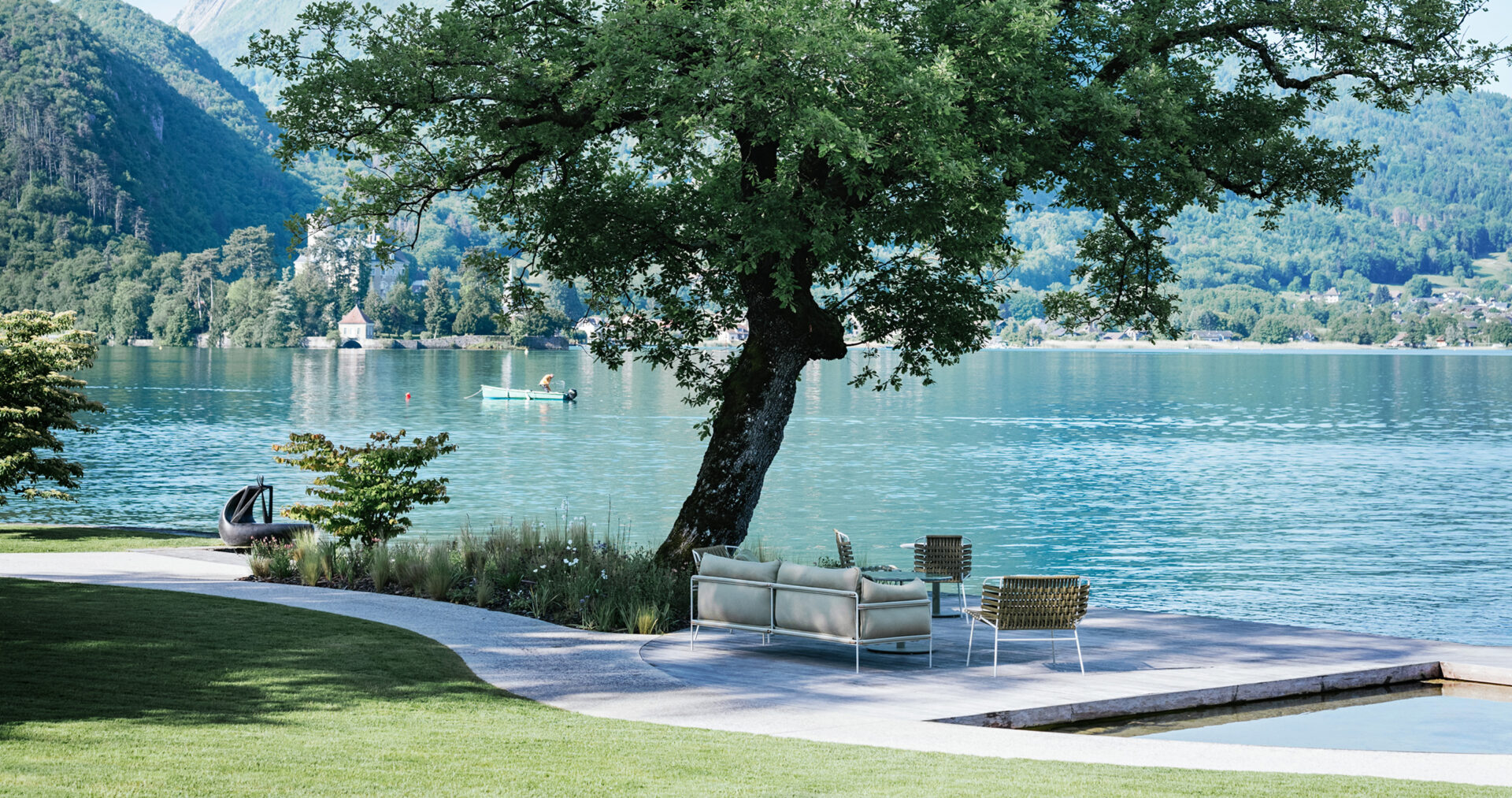 Guests of the five-star hotel, visitors, and passersby gather here from morning to night, enjoying the view and the cozy atmosphere. It is a unique space where you can experience the rhythm of the Auberge de Bise and enjoy its conviviality in a different way.