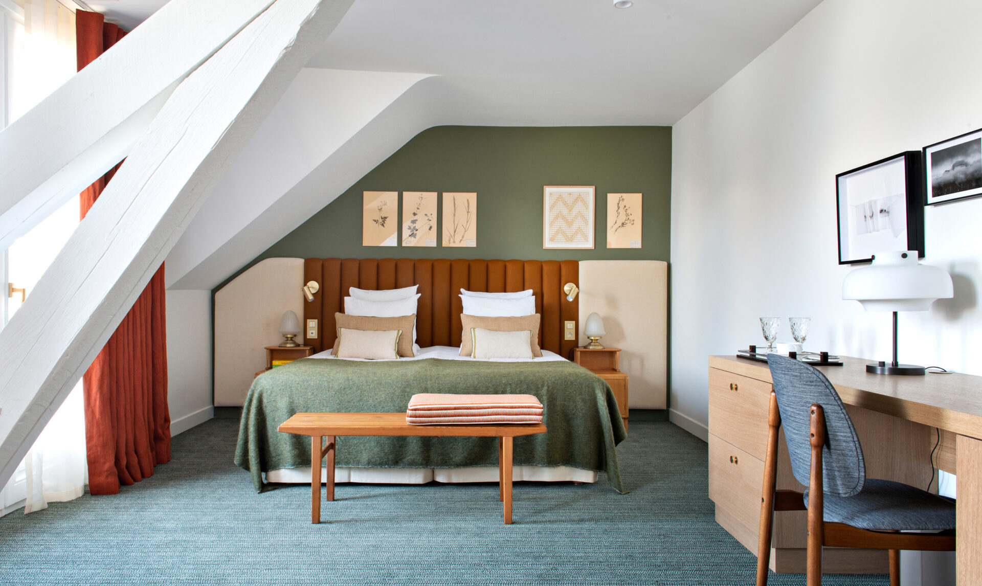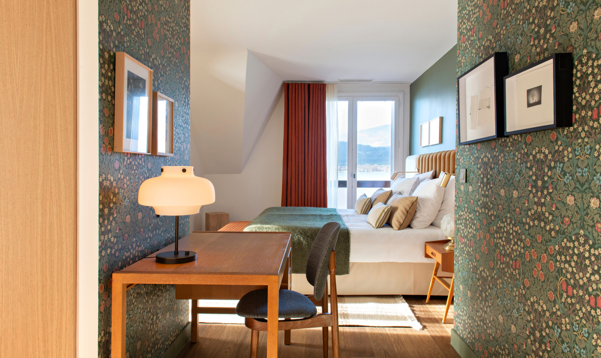 Signées par la décoratrice et scénographe Émilie Bonaventure, les suites juniors de l’Auberge du Père Bise, situées dans le bâtiment principal de l’hôtel 5 étoiles alignent de très beaux volumes et de véritables espaces salons, transformables au besoin en espace nuit complémentaire.